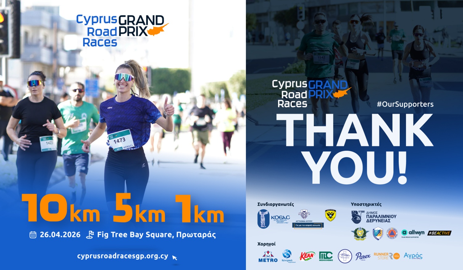 Οι φίλοι των δρομικών αγωνισμάτων θα έχουν την ευκαιρία αυτήν την Κυριακή, 26 Απριλίου 2026, για την πρώτη… αποτοξίνωση από τις «κραιπάλες» τού Πάσχα. Στο υπέροχο παραλιακό μέτωπο τού Πρωταρά, θα πραγματοποιηθεί ο 3ος φετινός αγώνας σε δημόσιο δρόμο τής σειράς Cyprus Road Races Grand Prix, με το ισχυρό δρομικό κίνημα τής Κύπρου να είναι έτοιμο για μία απολαυστική διαδρομή, στα 10 και 5 χιλιόμετρα, ενώ θα υπάρχει και ο δρόμος τού ενός (1) χιλιομέτρου, για τα παιδιά και τις οικογένειες. Μέχρι στιγμής οι συμμετοχές στα δύο πρώτα Cyprus Road Races Grand Prix, σε Λάρνακα και Στρόβολο, ήταν εντυπωσιακές και το ίδιο αναμένεται να γίνει στον Δήμο Παραλιμνίου – Δερύνειας, ο οποίος θα είναι ο οικοδεσπότης τού κυριακάτικου αγώνα.